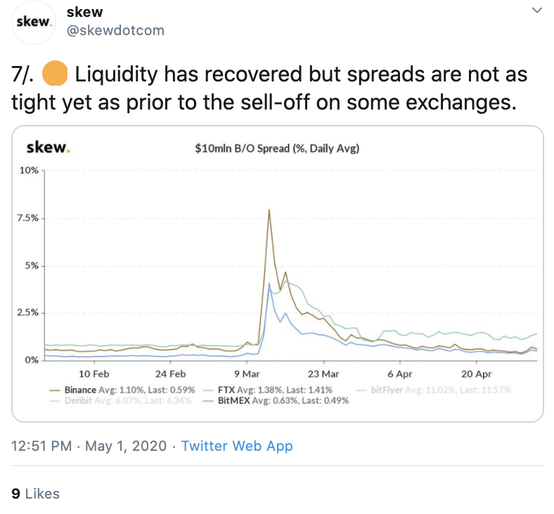 Ogólna płynność również wróciła do poziomów sprzed marcowego spadku, ale z pewnymi zastrzeżeniami. Niektóre giełdy nadal zauważają pewne braki w swoich księgach zamówień.