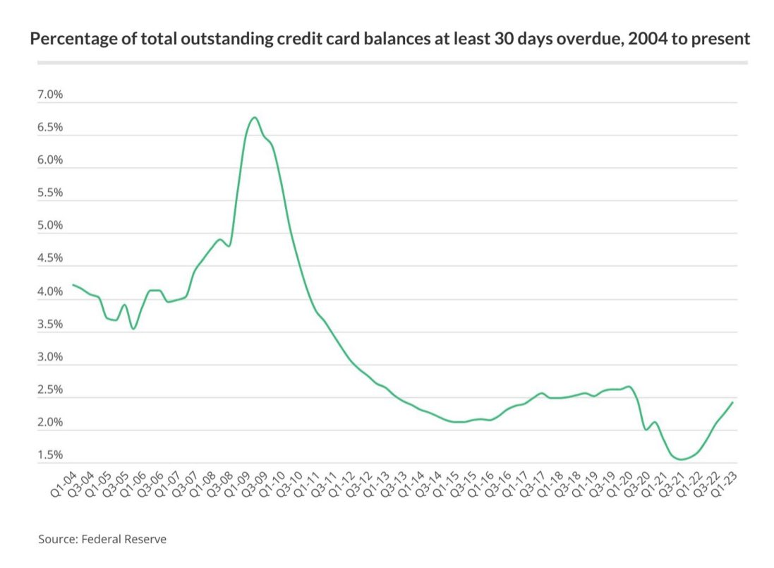 Jak pokazują nowe dane amerykańskiego banku centralnego, coraz więcej Amerykanów nie jest w stanie spłacić zadłużenia na kartach kredytowych. Odsetek zadłużenia kart kredytowych przekraczającego 30 dni wzrósł szósty kwartał z rzędu. Amerykańscy konsumenci coraz gorzej radzą sobie z inflacją, ale co to oznacza dla kursu Bitcoina (BTC)?