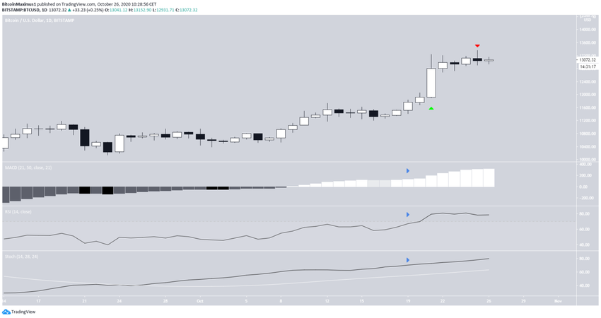 W tygodniu pomiędzy 19-26 października Bitcoin (BTC) osiągnął zamknięcie powyżej 13 000 USD. Podczas gdy długoterminowy trend jest zwyżkowy, wykres krótkoterminowy zaczął wykazywać słabość.