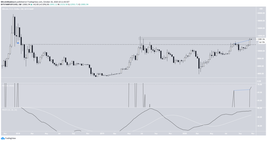 BTC nadal znajduje się w pobliżu długoterminowego poziomu oporu od 13 500 do 14 000 USD stworzonego przez szczyty knotów z lipca 2019 r. Jednak już przesunął się powyżej obszaru oporu na 11 800 USD, utworzonego przez tygodniowe zamknięcia od lutego 2018 r. (pokazane przerywaną poniżej).