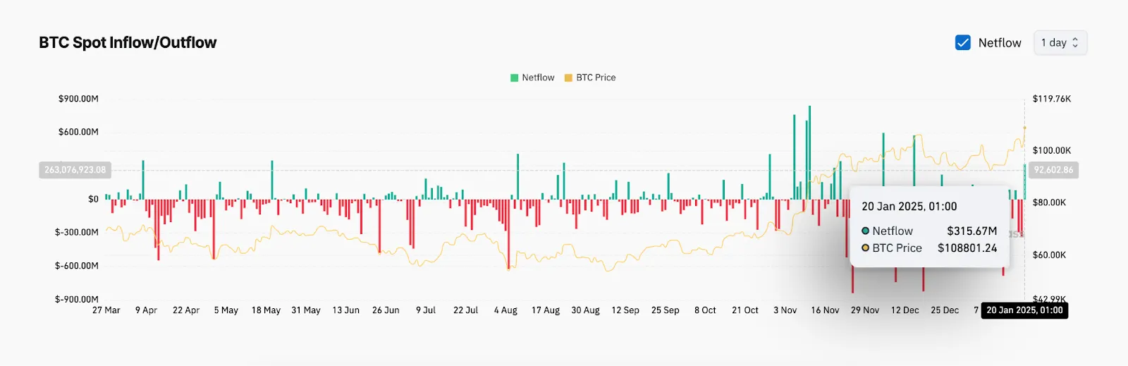 Warto zauważyć, że wpływy spot BTC wzrosły do 30-dniowego szczytu, potwierdzając wzrost popytu na monetę. Według Coinglass w chwili pisania tego tekstu jest to łącznie 316 mln USD.
