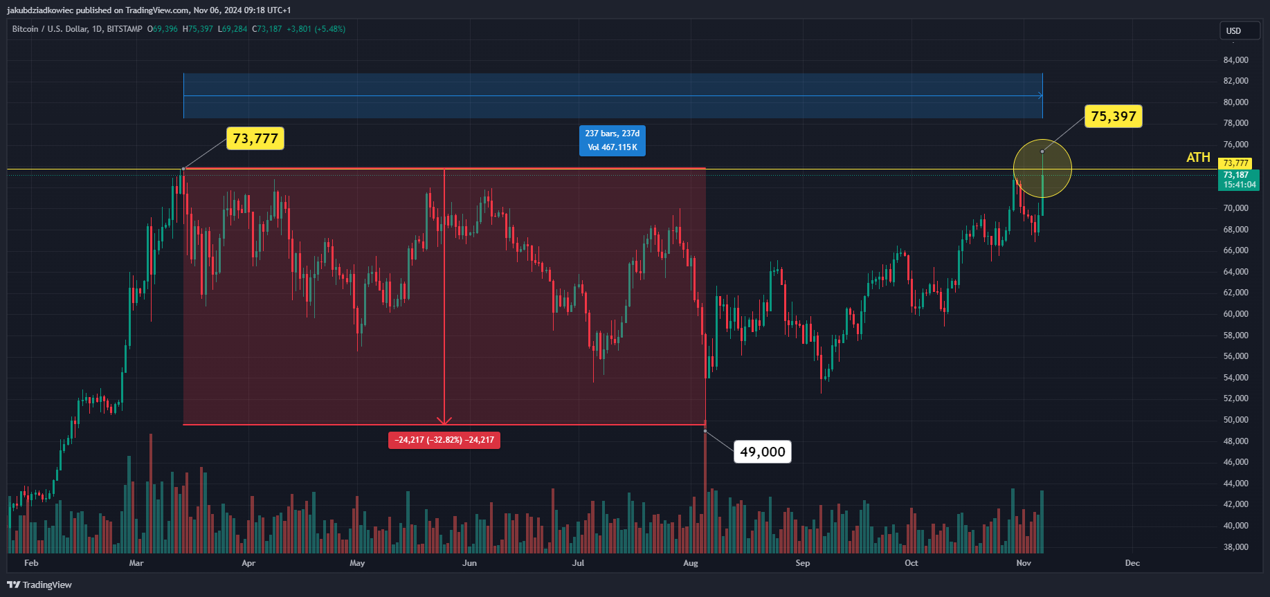 Nowy rekord wszech czasów dla Bitcoina na poziomie 75 397 USD to wydarzenie, które elektryzuje rynek kryptowalut. Co ciekawe, stało się to dokładnie w momencie pierwszych wyników wyborów w USA, które wskazują na zwycięstwo Donalda Trumpa. Po osiągnięciu poziomu 73 777 USD w marcu 2024 roku, BTC doświadczył gwałtownej korekty, spadając do 49 000 USD w sierpniu. Oznaczało to obniżkę ceny czołowej kryptowaluty o 33%.