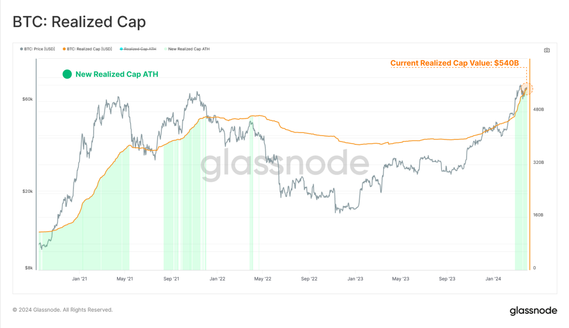 Zrealizowana kapitalizacja rynkowa Bitcoina wynosi obecnie 540 miliardów dolarów. Oznacza to wzrost o 79 miliardów dolarów w skali miesiąca.
