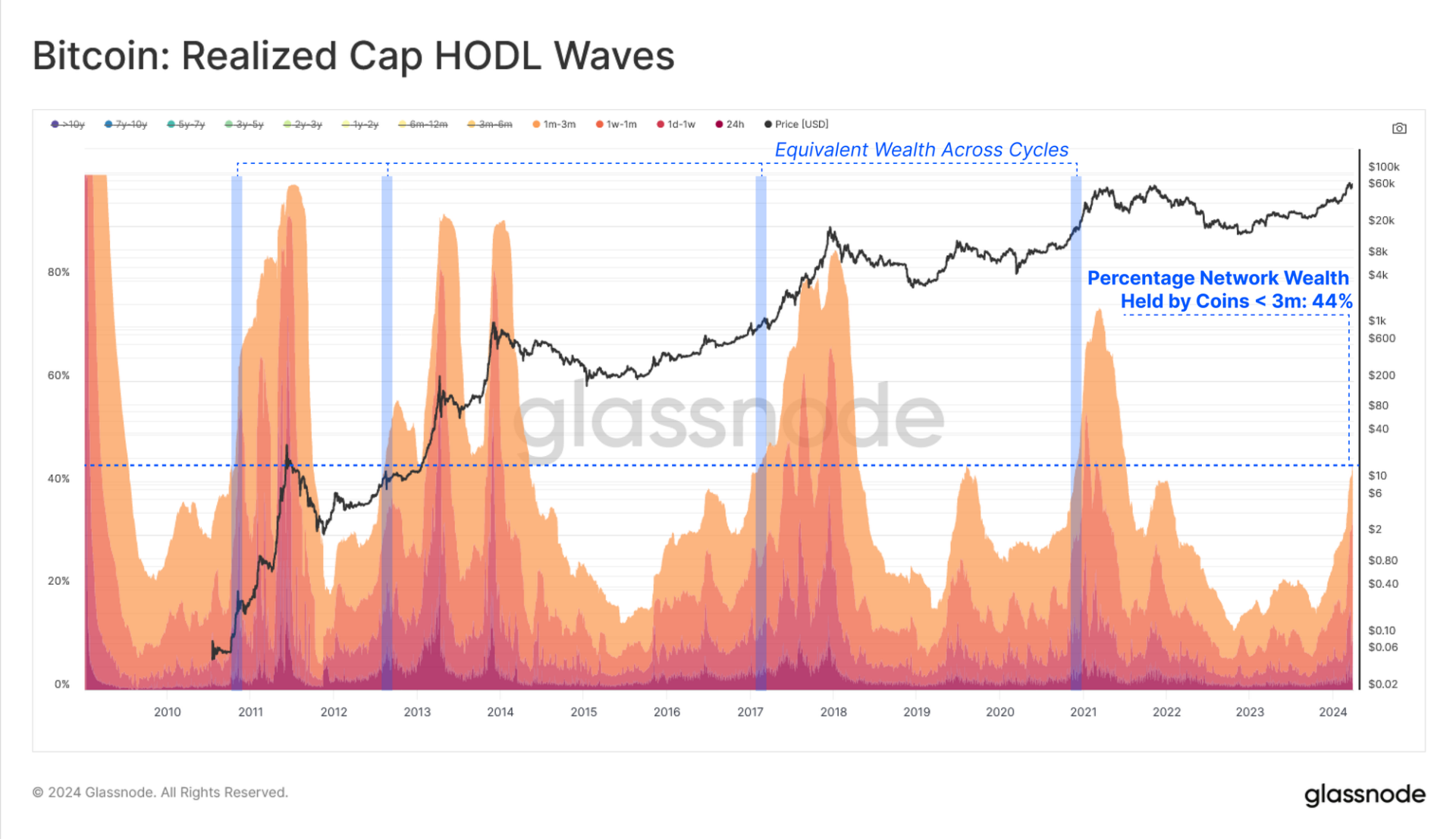 SponsoredGlassnode twierdzi ponadto, że 44 procent wszystkich Bitcoinów znajduje się obecnie w posiadaniu nowych adresów. Portfele te posiadają BTC krócej niż 3 miesiące. W oparciu o dane historyczne odsetek ten oznacza, że jesteśmy gdzieś w środku hossy.