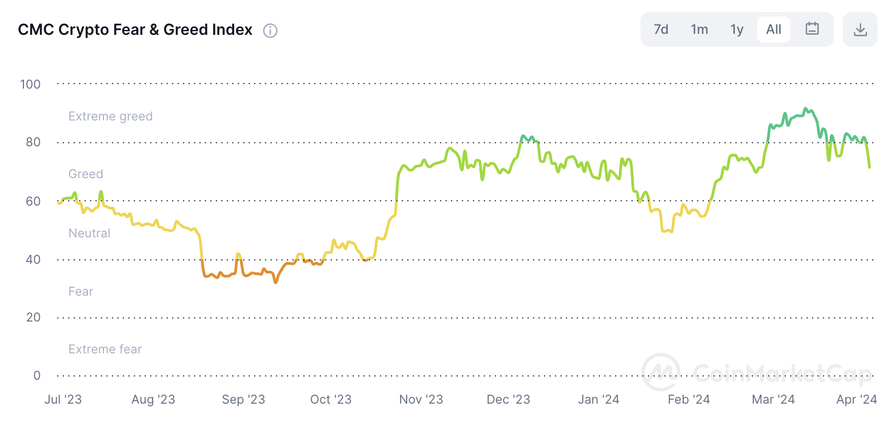 Indeks strachu i chciwości spadł teraz do poziomu 71/100, co oznacza, że nie jest to już “skrajna chciwość”, a jedynie “chciwość”.