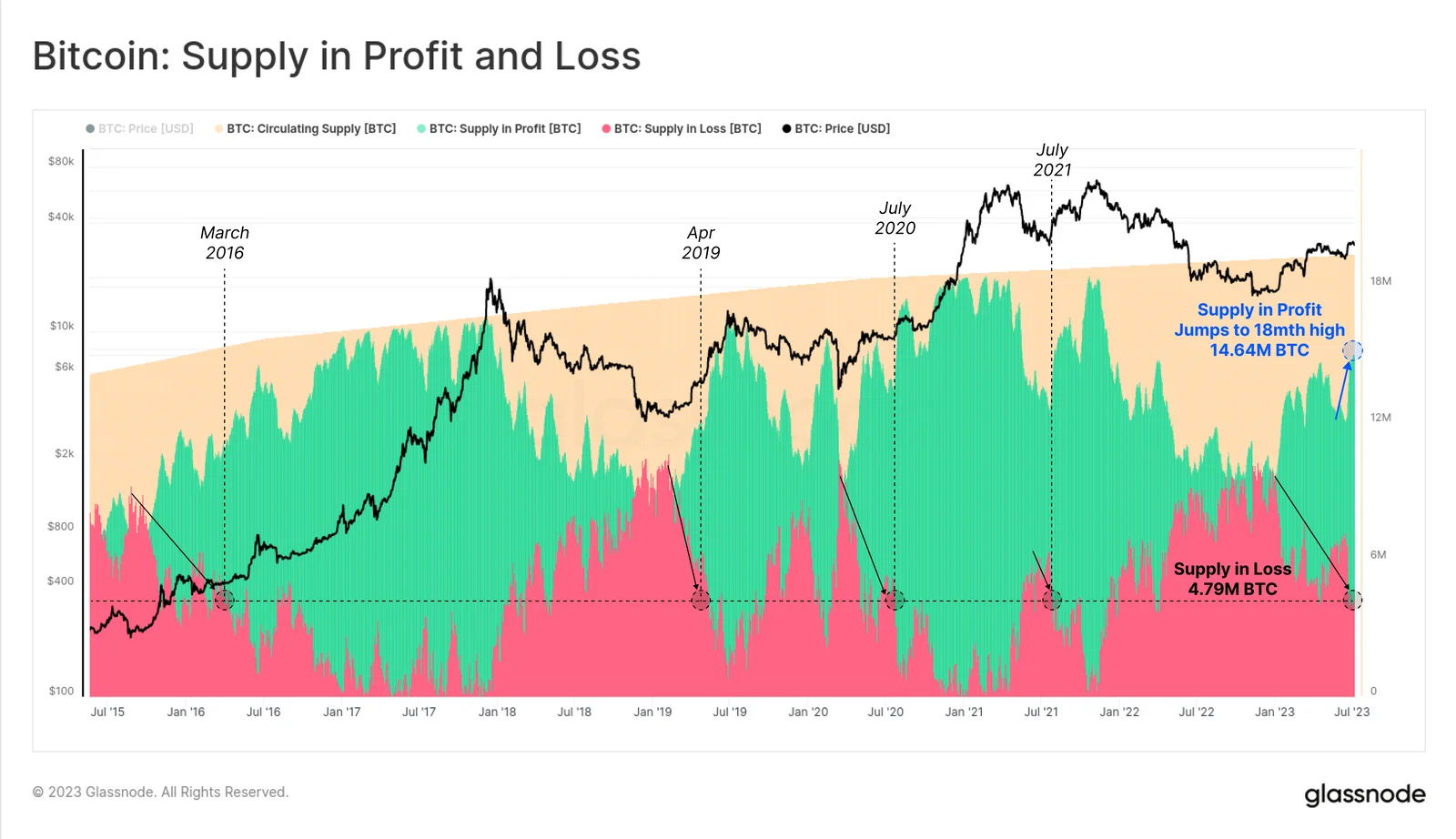 Gdy Bitcoin oscyluje wokół punktu środkowego na poziomie 30 000 USD, około 75% całkowitej podaży jest rentowne, podczas gdy pozostałe 25% przynosi straty. Ta równowaga między pozycjami zyskownymi i stratnymi zbiega się z punktami równowagi obserwowanymi w poprzednich cyklach. To z kolei sugeruje potencjalny okres ponownej akumulacji.