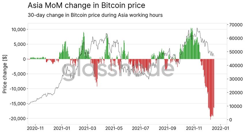 Aby dojść do tego wniosku, Glassnode porównał dzienne ceny BTC z tymi sprzed miesiąca. Ponadto wziął pod uwagę ogromne miesięczne zmiany cen w różnych porach dnia.
