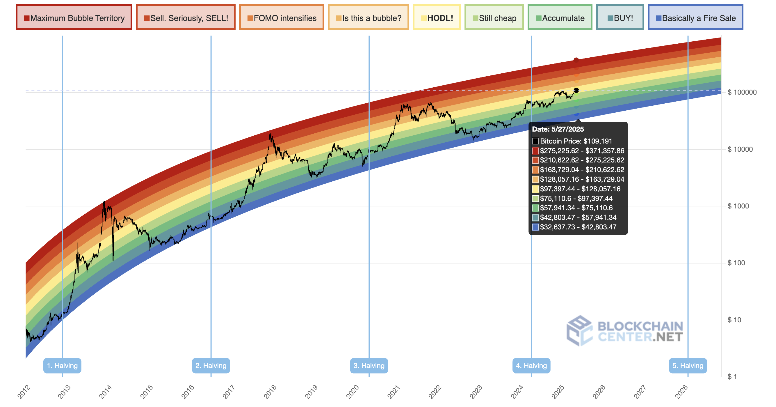 Po pierwsze, cel 200 000 USD jest przewidywany przy użyciu wykresu tęczy w wersji z 2023 roku. To narzędzie długoterminowej wyceny wykorzystuje logarytmiczną krzywą wzrostu do prognozowania potencjalnego kierunku ceny BTC. Jeśli to przewidywanie się sprawdzi, Bitcoin osiągnął dopiero połowę swojej drogi w tym cyklu.