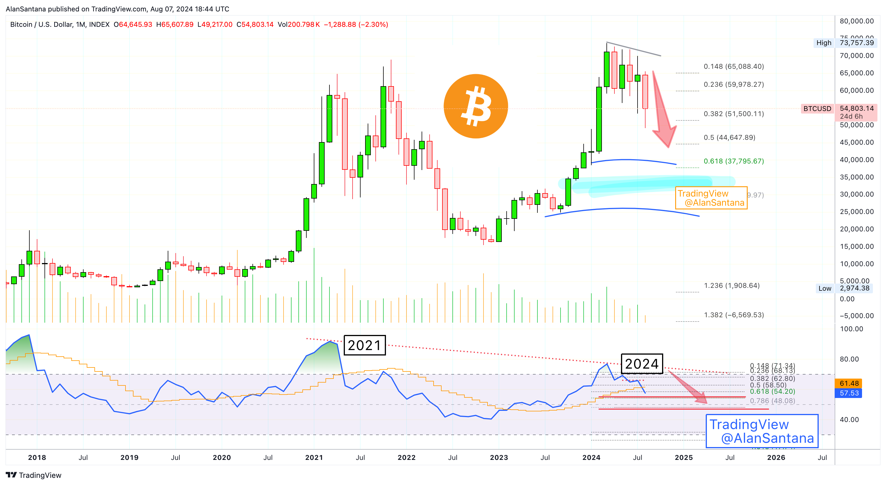 Alan Santana zauważa, że obecny wskaźnik siły względnej (RSI) Bitcoina wynosi 57,59, co wskazuje na możliwy trend wzrostowy. Niemniej jednak analityk ostrzega przed możliwym spadkiem RSI, co mogłoby prowadzić do krótkoterminowych problemów dla Bitcoina. Santana porównuje obecną sytuację do tej z maja 2022 roku, kiedy to RSI spadł do poziomu 48, a cena BTC wahała się w przedziale od 40 000 do 25 000 USD.