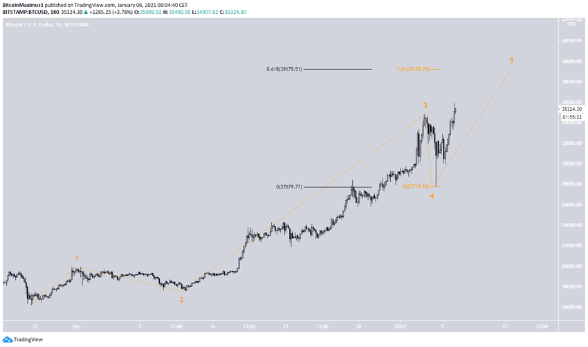 Bliższe przyjrzenie się ruchowi daje cel na 39 170 USD, znaleziony przez rzutowanie długości fal 1-3 (czarne) i użycie zewnętrznego zniesienia na fali 4 (pomarańczowej).