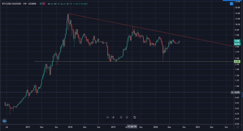Cramer w swojej analizie niewiele mówił o Bitcoinie. Jednak spojrzenie na relację Bitcoin/złoto (BTCUSD/XAUUSD) sugeruje, że mógł on coś przegapić. Współczynnik ten, będąc świeżym dodatkiem do kolekcji portalu TradingView, śledzi dynamikę relacji między Bitcoinem a złotem od 2017 roku.