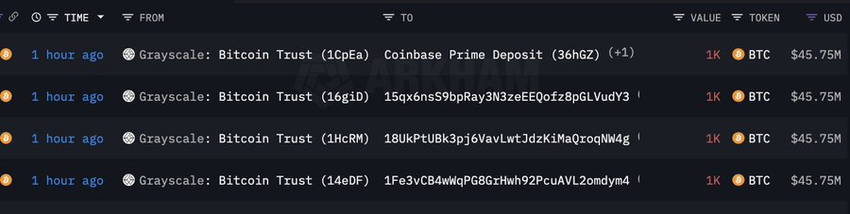 Wśród wzmożonej aktywności handlowej, Grayscale przeniosło 4000 BTC o wartości 183 mln USD do Coinbase. Transakcja ta, przeprowadzona w czterech partiach po 1000 BTC każda, miała miejsce na Coinbase Prime, znaczącym uczestniku niedawno zainicjowanych ETF-ów Bitcoina.