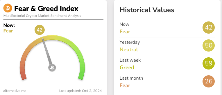 Wydarzenia na rynku wpłynęły również na nastroje inwestorów. Indeks strachu i chciwości krypto spadł teraz do zakresu “strachu”, osiągając poziom 42 z neutralnego wyniku 50 dzień wcześniej. Ta zmiana podkreśla wrażliwość rynku na zewnętrzne zaburzenia geopolityczne i ich silny wpływ na zachowania inwestorów.