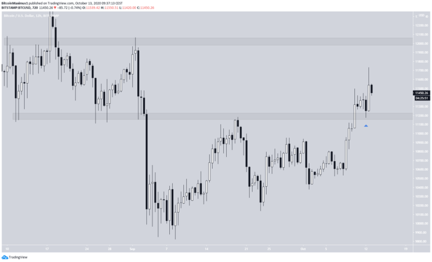 Następnie cena utworzyła niższy knot, aby zweryfikować obszar jako wsparcie przed dalszym ruchem w górę. BTC osiągnął lokalny szczyt na poziomie 11 731 USD, a kolejny najbliższy obszar oporu znajduje się na poziomie 12 000 USD.