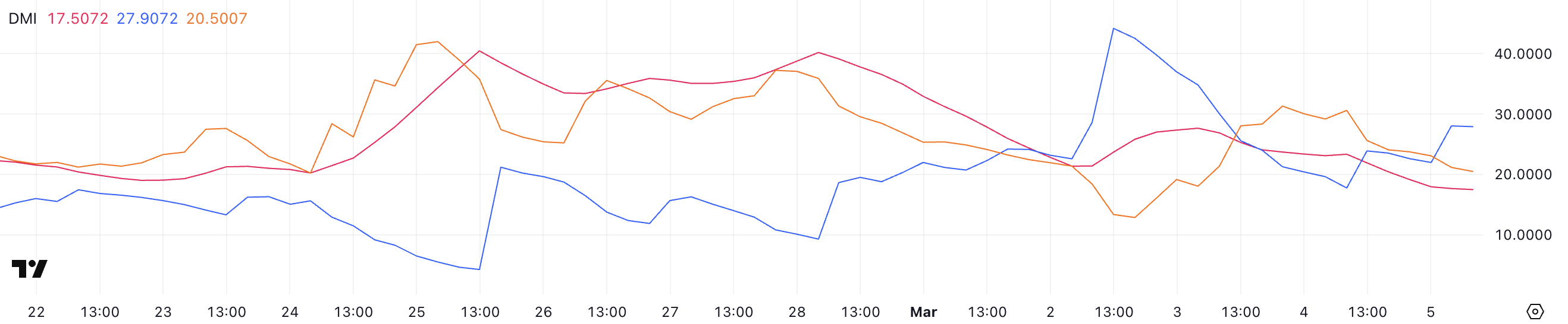 Wskaźnik kierunkowego ruchu (DMI) dla Bitcoina pokazuje, że ADX spadł do 17,5 z poziomu 27,6 zaledwie dwa dni temu. Spadający ADX wskazuje na osłabienie siły trendu, co oznacza, że poprzedni trend spadkowy stracił impet.