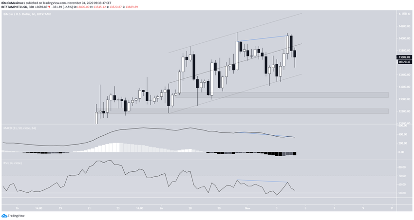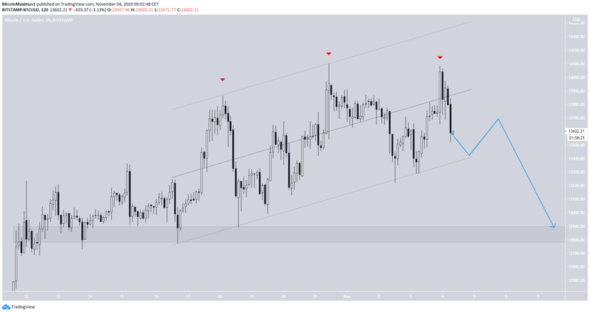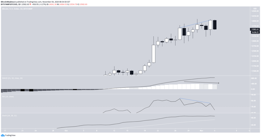 W dniu 3 listopada Bitcoin (BTC) znacznie wzrósł, osiągając kolejny rekord powyżej 14 000 USD. Jednak wyższych cen nie udało się utrzymać i wkrótce potem cena ponownie spadła.