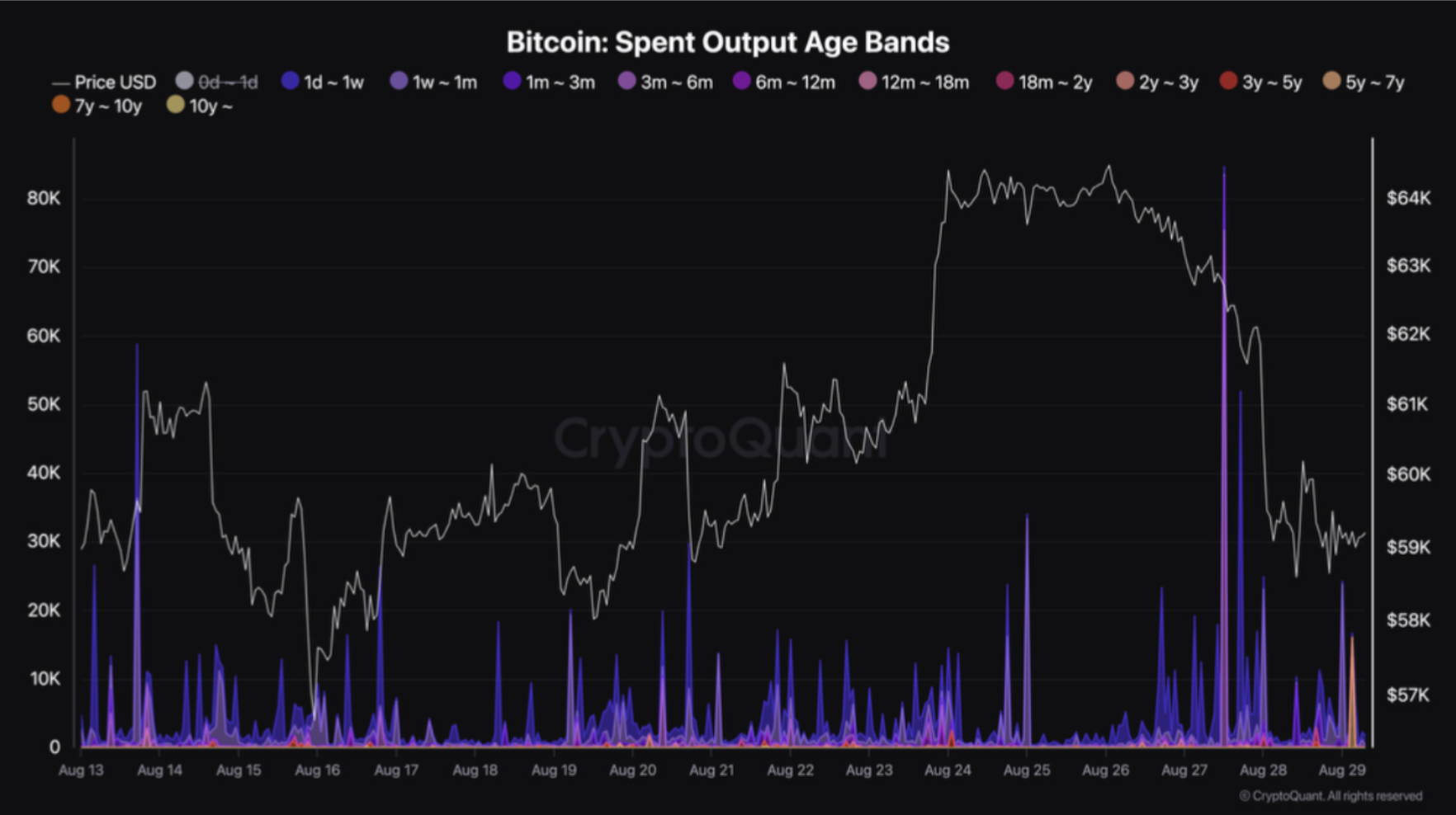 Dalsza analiza pasm wieku wydanych wyjść Bitcoina ujawnia szeroką dystrybucję monet przez różne grupy posiadaczy w ciągu ostatnich kilku dni. Raport analityka Cryptoquant, XBTManager, wskazuje na duże transfery: 7788 monet w wieku od 1 do 3 miesięcy i 75 228 monet w wieku od 3 do 6 miesięcy w dniu 27 sierpnia.