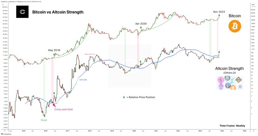 Niemniej jednak, Bitcoin zyskał na wartości ponad 100% od początku roku (YTD). Przewyższa tym samym większość najważniejszych 100 aktywów kryptowalutowych w okresie jednego roku. Jednak zauważalny trend wskazuje, że altcoiny zyskują znaczącą siłę, co potwierdza ich niedawne przekroczenie bariery 50-tygodniowej prostej średniej kroczącej (SMA). Ten byczo-skierowany impet jest korzystny nie tylko dla altcoinów, ale również wróży dobrze dla Bitcoina.