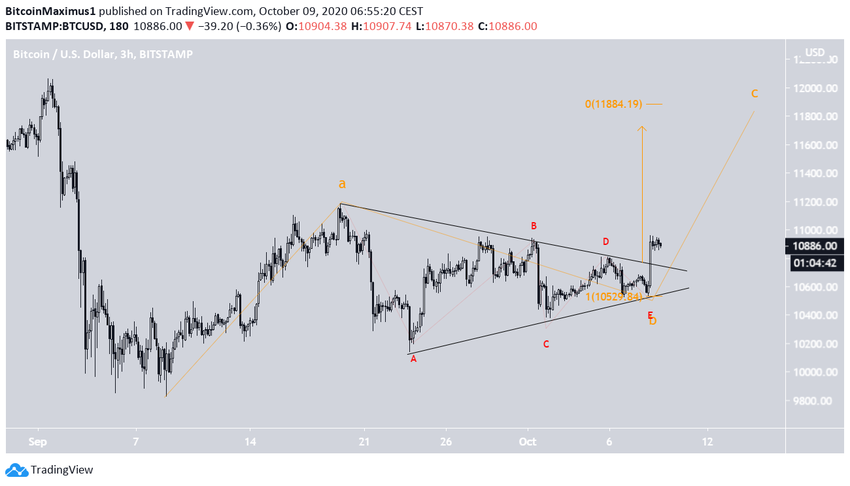 Istnieje alternatywna liczba fal, która sugeruje, że wybicie trójkąta było falą B formacji A-B-C (pomarańczowa). Taka liczba nadal sugeruje, że cena wzrośnie do poziomu 11 800 USD, celu wyznaczonego przez rzutowanie długości fali A na C i długości trójkąta do punktu przełamania.