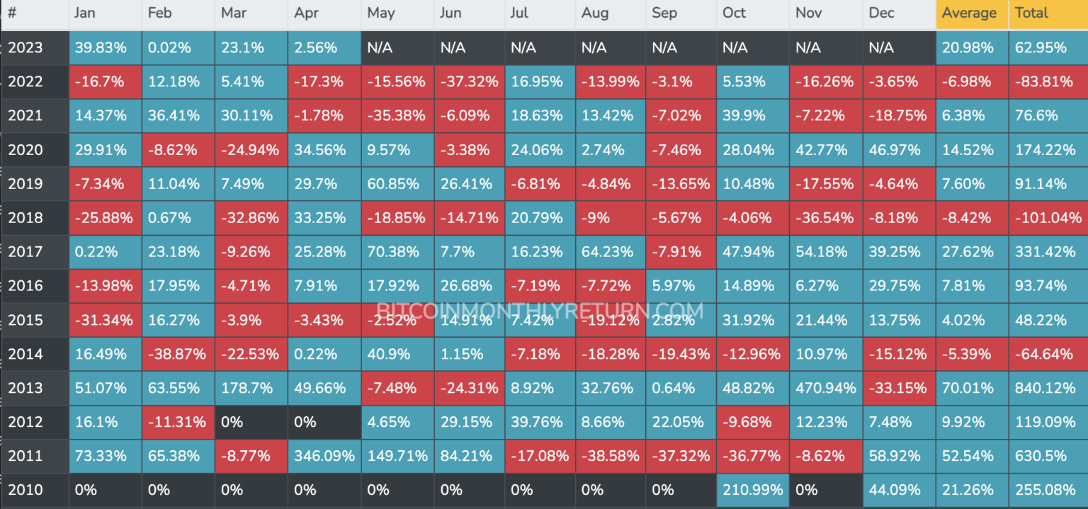 Poniższa tabela pokazuje jak Bitcoin radzi sobie historycznie w maju.
