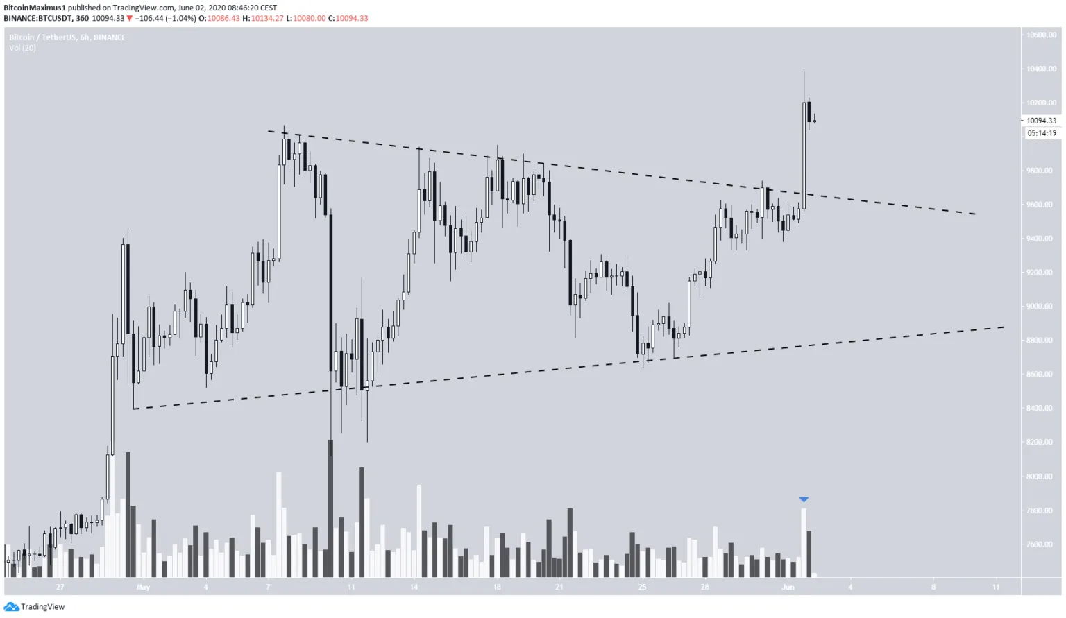W dniu 1 czerwca cena Bitcoina wyłamała się z długoterminowego trójkąta symetrycznego, który występował od 30 kwietnia.