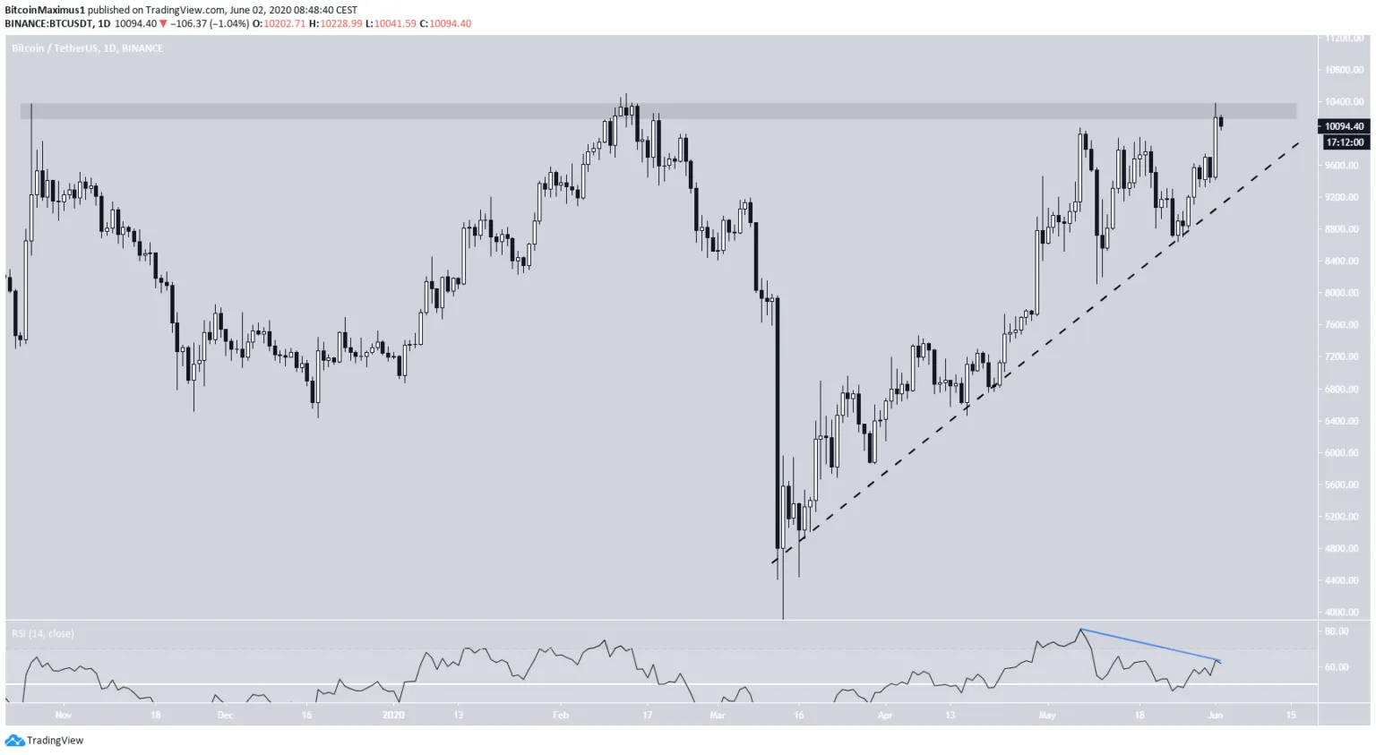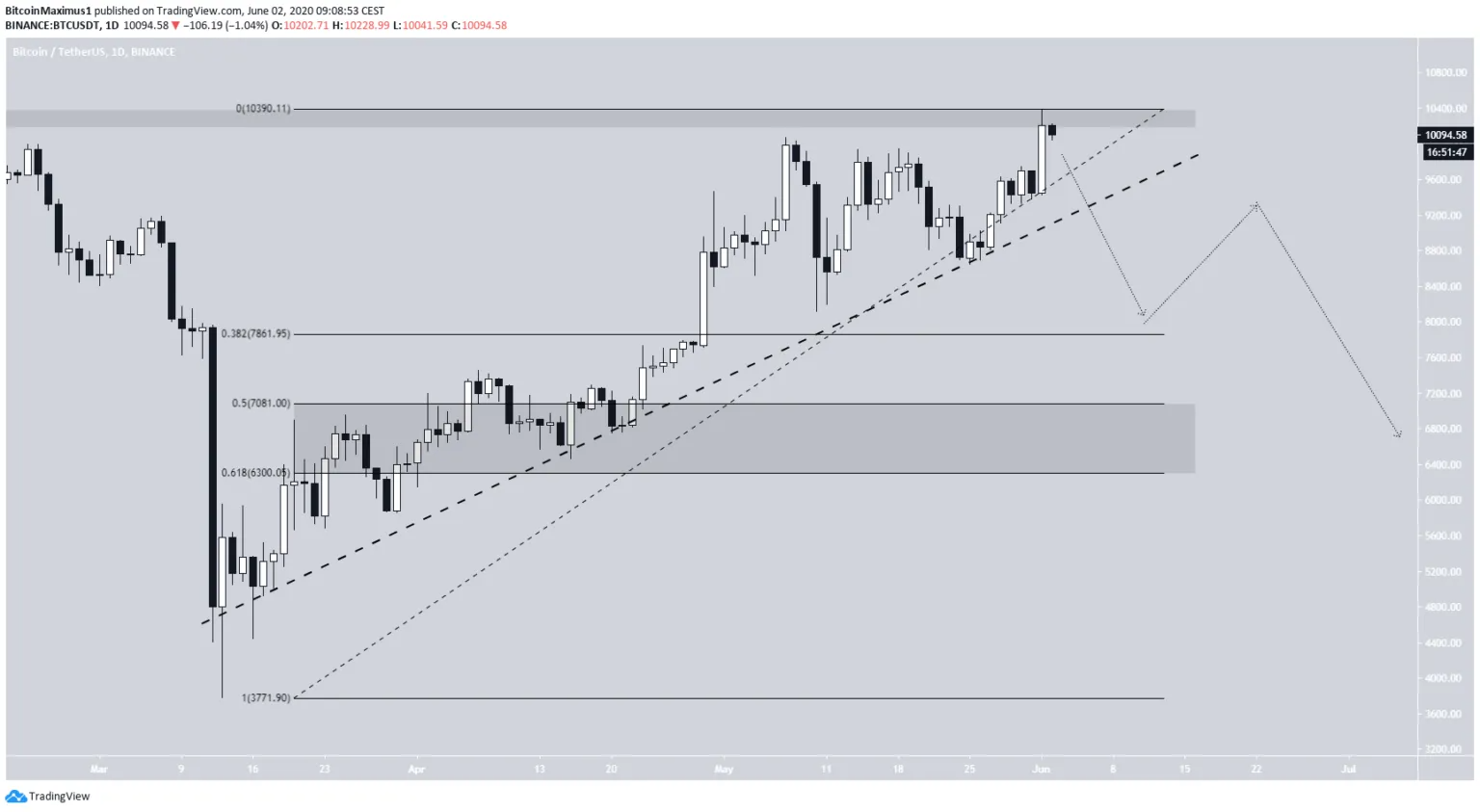 W dłuższej perspektywie widać, że główny obszar oporu znajduje się na poziomie 10,400 dolarów, a cena prawdopodobnie stworzy potrójny szczyt wewnątrz niego. Cena BTC nie przekroczyła tego poziomu od września 2019 roku. Cena podąża również za bardzo stromą, wznoszącą się linią wsparcia, która obecnie zapewnia wsparcie bliskie 9,500 dolarów.