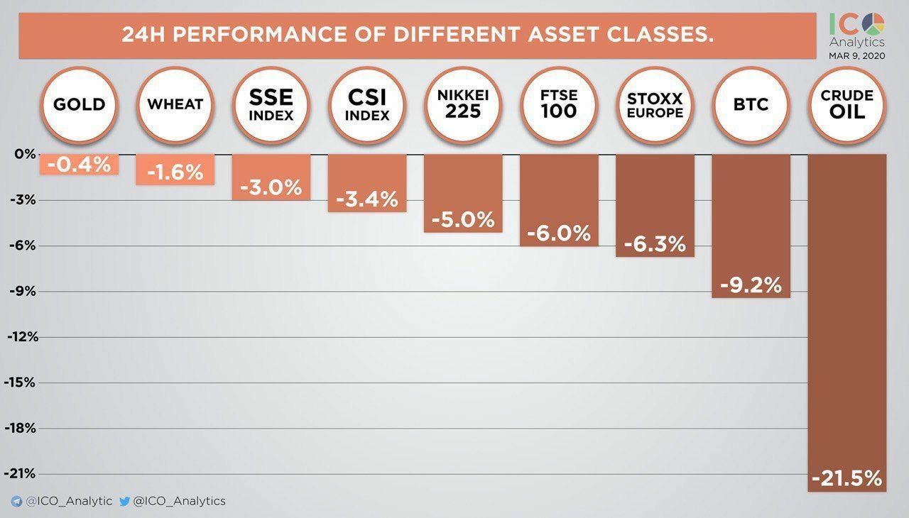 Według ICO Analytics (@ICO_Analytics) straty są ogromne. Biorąc pod uwagę spadek ropy naftowej o około 21 procent, Bitcoin nie pozostaje daleko w tyle. Złoto pozostaje najbardziej stabilne, ale też odnotowuje niewielkie straty. Od czasu opublikowania tego wykresu Bitcoin faktycznie spadł jeszcze mocniej i obecnie traci około 10% dziennie.