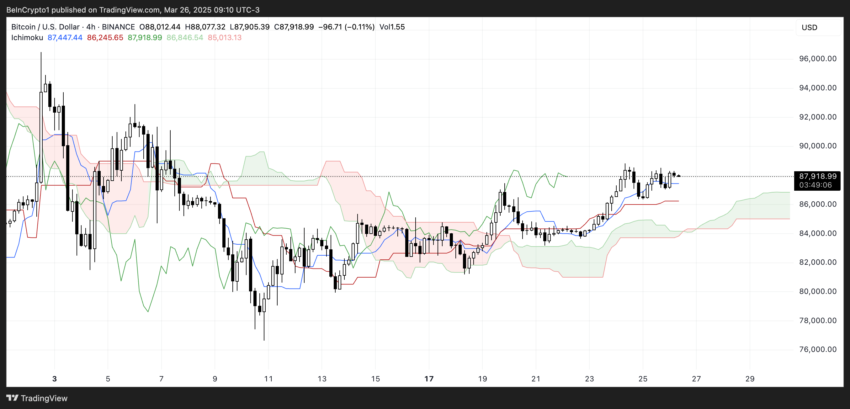 Wykres chmury ichimoku Bitcoina pokazuje wzrostową strukturę, z akcją cenową wyraźnie powyżej chmury. Natomiast sama chmura zmienia kolor na zielony i rośnie do przodu.