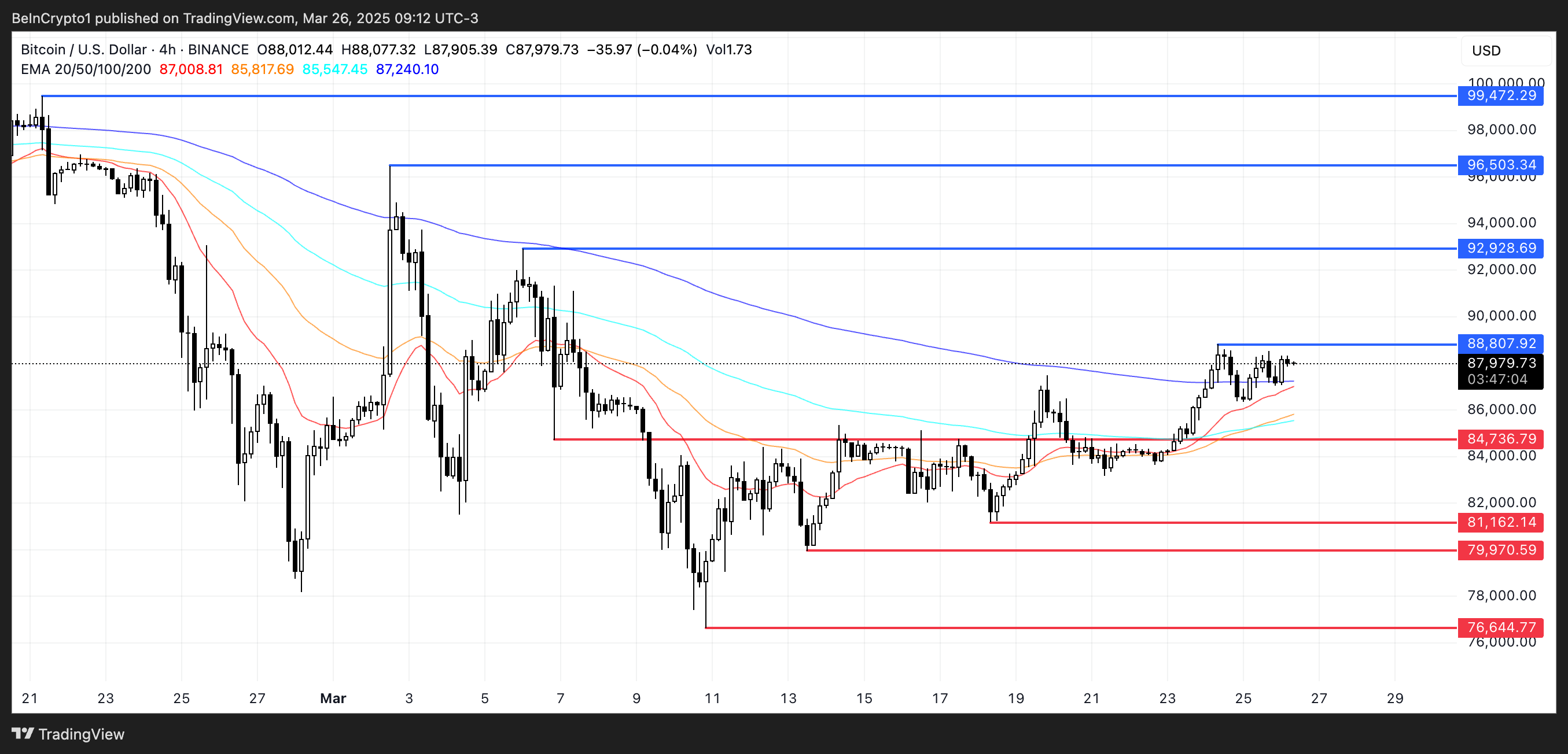 Linie EMA Bitcoina ustawiają się na potencjalny złoty krzyż, co może sygnalizować początek nowej fazy wzrostowej. Jeśli to przecięcie nastąpi i cena Bitcoina zdoła przełamać opór na poziomie 88 807 USD, może to wywołać ruch w kierunku 92 928 USD.