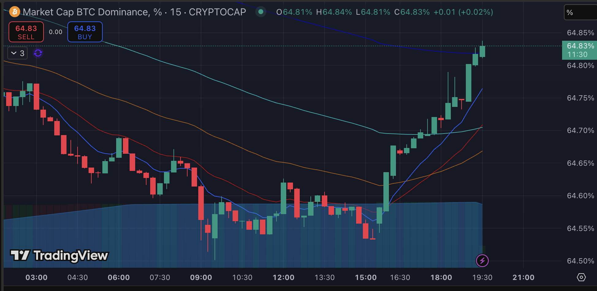 Dominacja Bitcoina (BTC.D) zaczęła rosnąć od godziny 15:00 i osiągnęła już 64,85%. To oznacza, że Bitcoin przejmuje większy udział w całkowitej kapitalizacji rynku kryptowalut. Wzrost dominacji może wpływać na spadki altcoinów, ale podkreśla siłę BTC. W takich momentach wiele osób decyduje się inwestować właśnie w Bitcoina.
