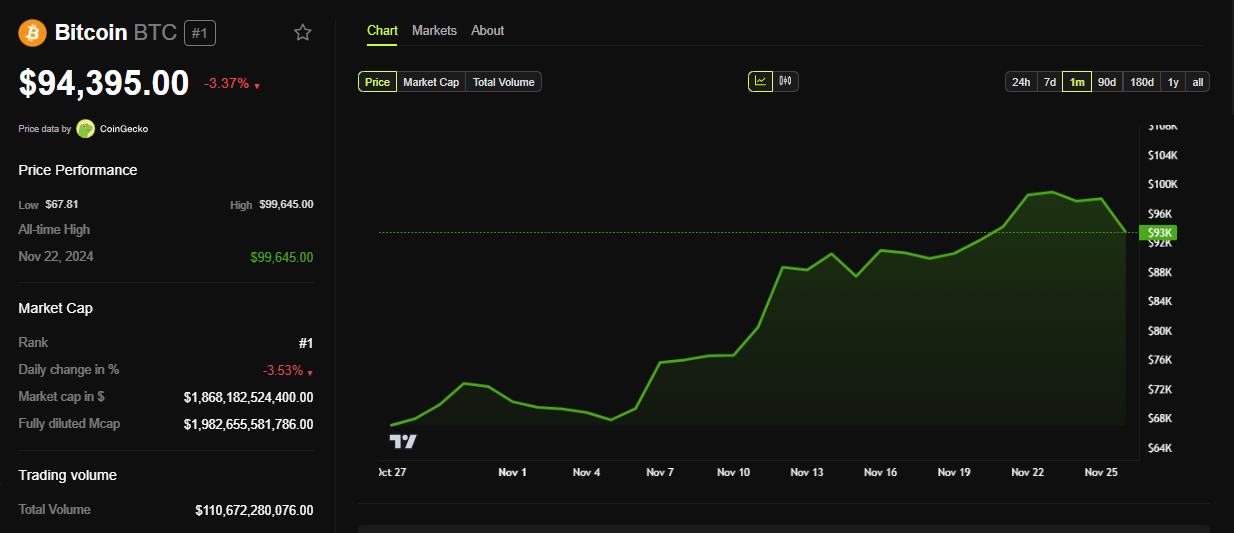 W momencie pisania tego tekstu Bitcoin jest notowany w okolicach 92 000 USD. Dane BeInCrypto pokazują, że spadł o 3,37% od otwarcia sesji we wtorek.