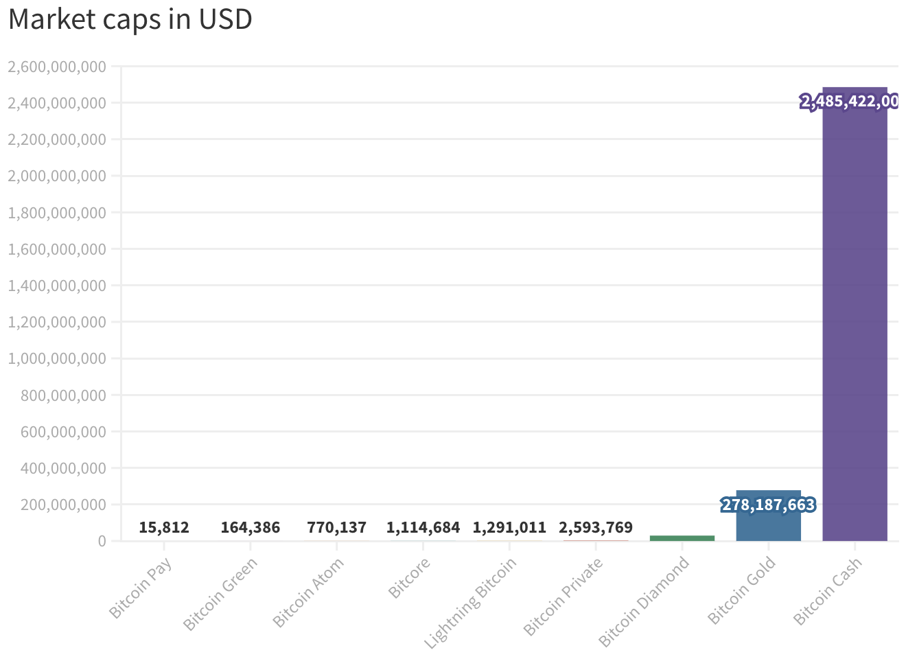 Poniższa tabela przedstawia kapitalizację rynkową (obecna cena razy liczba monet w obiegu) różnych kopii Bitcoina. Według Coinmarketcap, pełne dane są dostępne tylko dla podzbioru forków.