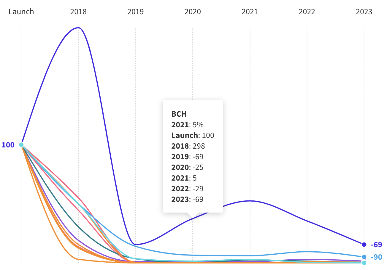 Wszystkie monety zaczynają się od 100 i przez lata patrzymy, jak bardzo cena zmienia się procentowo od pozycji wyjściowej. Górna linia to cena Bitcoin Cash.
