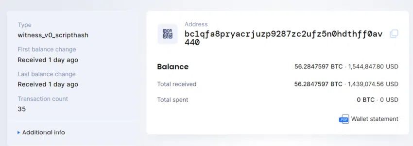Według danych on-chain, portfel użyty w ataku zawiera 56 BTC o wartości. Środki warte były ponad 1,5 miliona dolarów w czasie ataku. Dane Etherscan wykazały, że atakujący przeniósł również około 21,79 Ethereum (39 043 USD) przez zdecentralizowaną giełdę Uniswap (DEX).