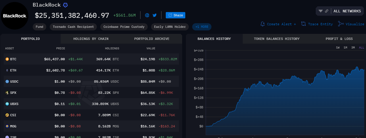 IBIT od BlackRock jest liderem rynku w sektorze ETF-ów na Bitcoina w USA. Zarządza prawie 370 000 BTC, stając się jednym z największych posiadaczy BTC. IBIT już przewyższył posiadłości Bitcoina MicroStrategy i teraz ustępuje miejsca tylko Satoshi Nakamoto i Binance. Dane z Arkham pokazują, że zapasy BTC w rękach BlackRock są warte 25,35 mld USD.