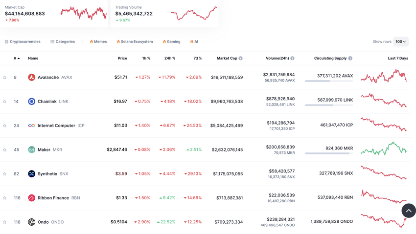 Pomimo tych pozytywnych trendów, szerszy sektor tokenów RWA nadal stoi przed wyzwaniami. Dane CoinMarketCap pokazują spadek o 7% całkowitej kapitalizacji rynkowej tokenów RWA, która obecnie wynosi 44,15 mld USD.
