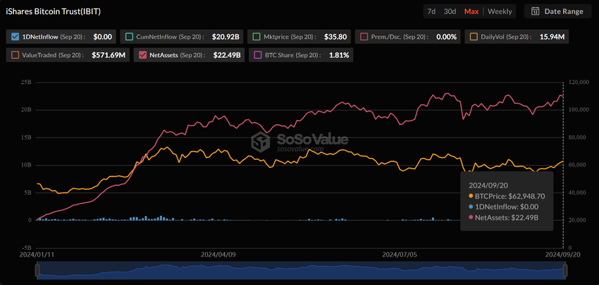 Bitcoin ETF od BlackRock, iShares, od dawna jest liderem w segmencie kryptowalutowych ETF-ów. Według danych od SoSo Value wartość aktywów netto IBIT wynosi ponad 22,49 mld USD na dzień 20 września.