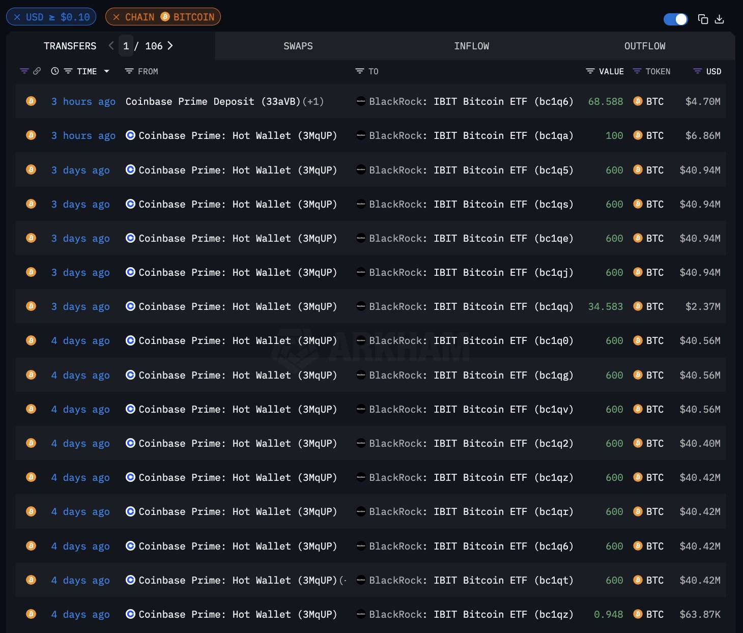 Tymczasem wzór dużych zakupów przez BlackRock nie wykazuje oznak spowolnienia. Dane z Lookonchain ujawniają, że w poniedziałek BlackRock dokupił Bitcoina za kolejne 300 mln USD, nabywając 4 369 monet. Stanowiło to większość Bitcoinów kupionych przez wszystkich emitentów ETF 28 października.