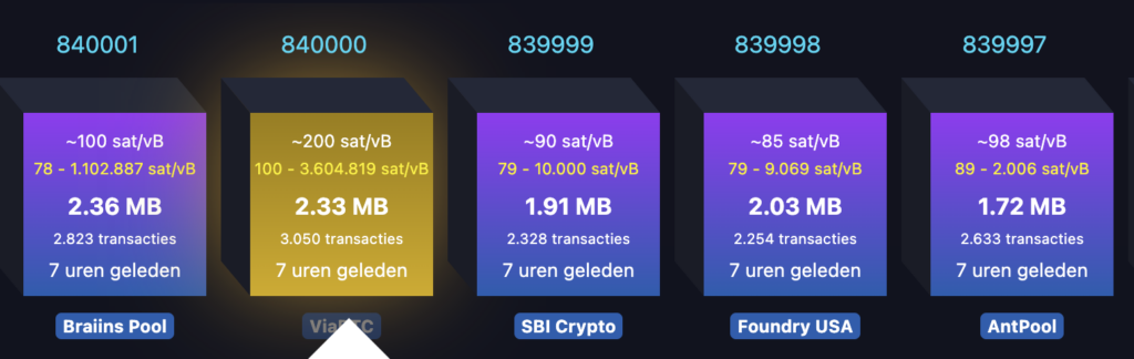 Tak więc górnik, który znalazł blok 840 000, otrzymał tylko połowę nagrody za blok: 3,25 zamiast 6,50. Z drugiej strony, górnik ten mógł również zaksięgować 37,7 Bitcoinów w opłatach.