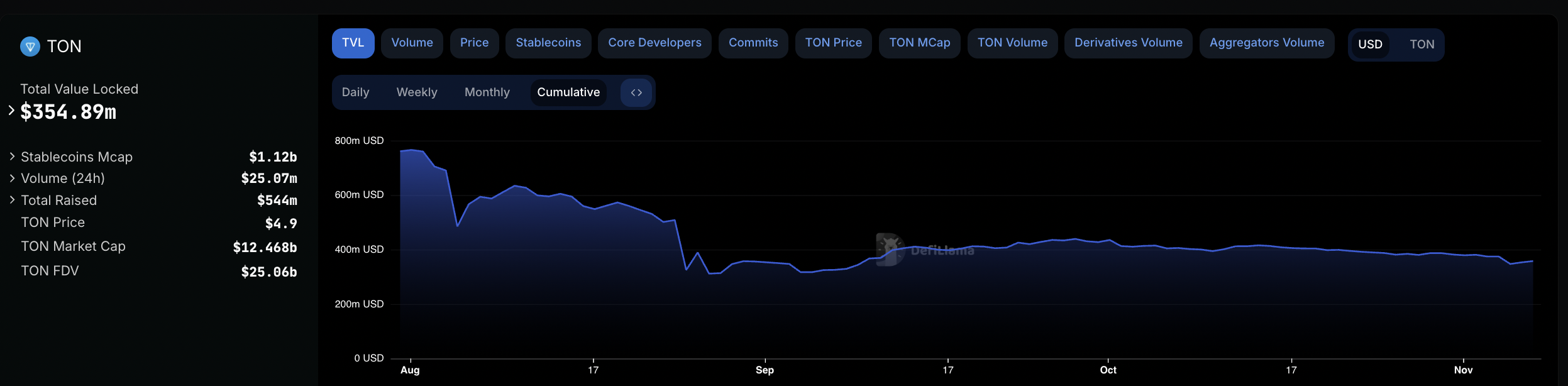 Tymczasem DeFiLlama informuje, że całkowita wartość zablokowanych aktywów na blockchainie TON spadła do 354 mln USD. Plasuje go na 21 miejscu, mimo że jeszcze kilka miesięcy temu znajdował się w pierwszej dziesiątce. Wskazuje to na trend, w którym użytkownicy gromadzą tokeny, sprzedają je, a następnie przestają angażować się w platformę.