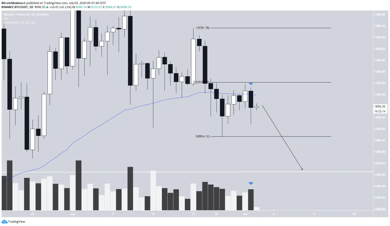 Cena Bitcoina rosła, odkąd dnia 29 czerwca wyłamała się z opadającej linii oporu. Wzrost trwał do 1 lipca, kiedy cena zaczęła się stopniowo obniżać, co nasiliło się następnego dnia.