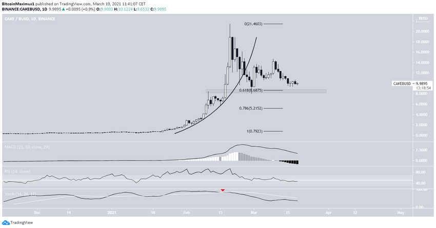 CAKE spada od czasu, gdy w dniu 19 lutego osiągnął nowy rekord wszech czasów na 21,45 USD. Wkrótce potem załamał się z parabolicznej rosnącej linii wsparcia.