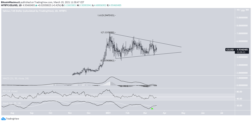 Celsius (CEL) jest notowany wewnątrz symetrycznego trójkąta. Kierunek trendu nie jest jasny, ale nieco bardziej prawdopodobne wydaje się wybicie.