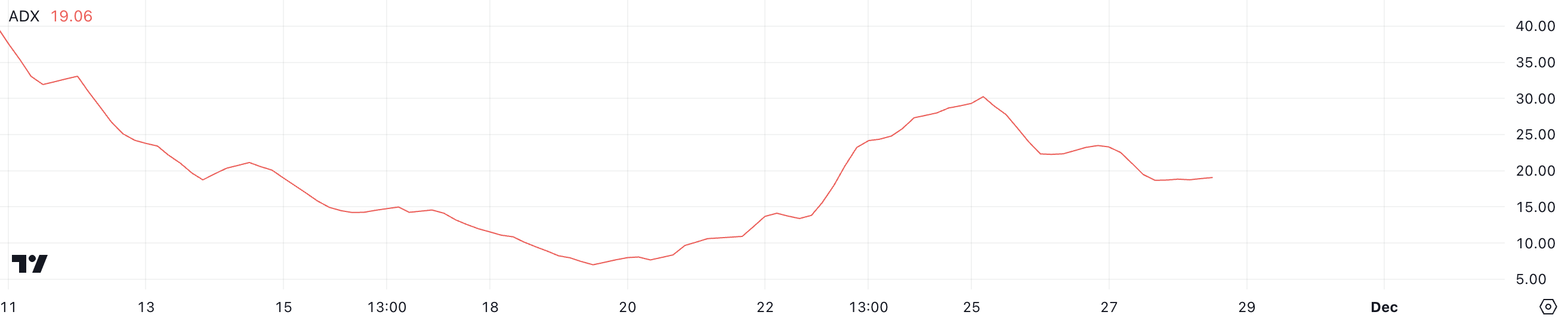 BNB ADX wynosi obecnie 19, spadając z ponad 30 zaledwie dwa dni temu, co sygnalizuje osłabienie trendu. ADX, czyli wskaźnik średniego kierunku, mierzy siłę trendu w skali od 0 do 100, nie wskazując jego kierunku.