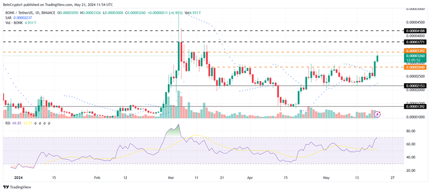 Cena Bonk aktualnie doświadcza wpływu rosnącego wzrostu rynku i optymizmu posiadaczy memecoina. To ostatnie jest widoczne w stopie finansowania memecoina, która osiągnęła najwyższy poziom od dwóch i pół miesiąca.
