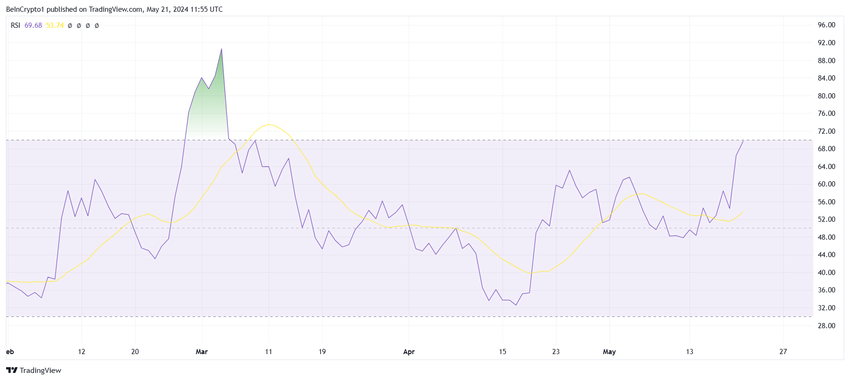 Dzieje się tak, ponieważ wskaźnik siły względnej (RSI) znajduje się na progu wejścia w strefę wykupienia. RSI to narzędzie analizy technicznej, które ocenia wielkość ostatnich zmian cen w celu oceny warunków wykupienia lub wyprzedania na rynku.