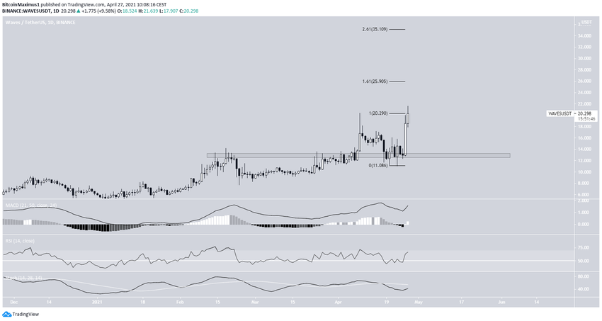 W dniu 9 kwietnia WAVES osiągnął ówczesny ATH na poziomie 20,35 USD i spadł. Korekta posłużyłą do zweryfikowania obszaru 13 USD jako wsparcia przed rozpoczęciem kolejnego odbicia.