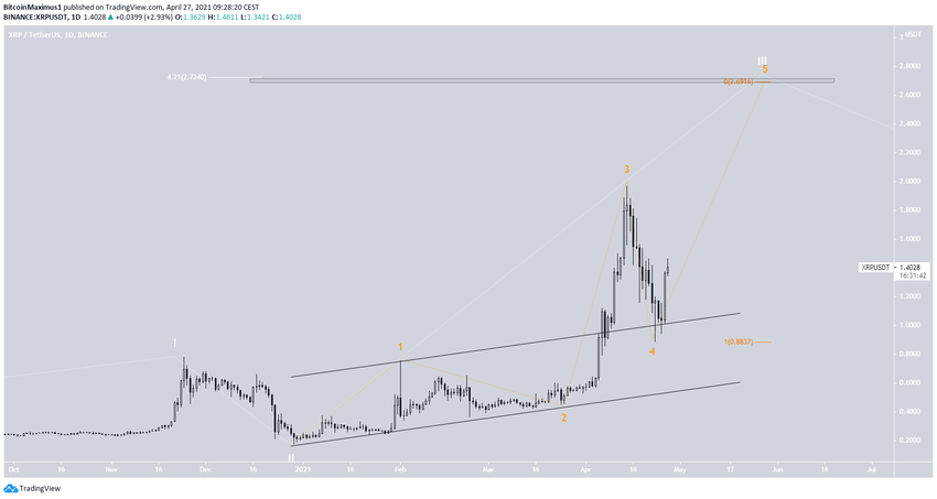 XRP spada od czasu, gdy w dniu 14 kwietnia osiągnął lokalny szczyt na poziomie 1,96 USD. Jest prawdopodobne, że był to szczyt trzeciej fali podrzędnej (kolor pomarańczowy).