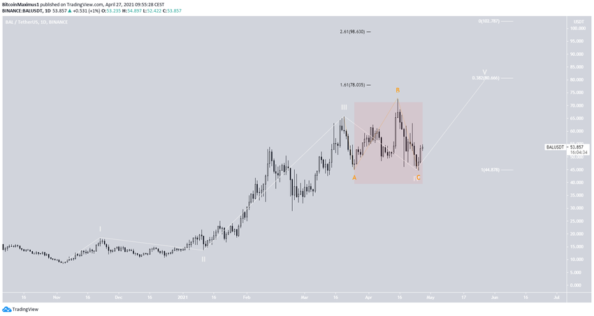 BAL spadał od czasu, gdy w dniu 15 kwietnia osiągnął ATH o wartości 72,63 USD. W dniu 25 kwietnia osiągnął lokalny dołek na 43,73 USD i odbił się.
