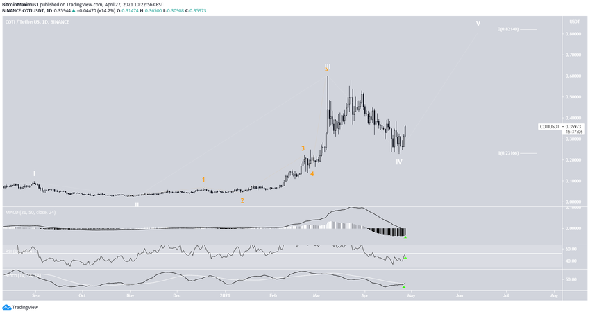Kurs COTI spadał od 8 marca, kiedy osiągnął ATH na 0,60 USD.